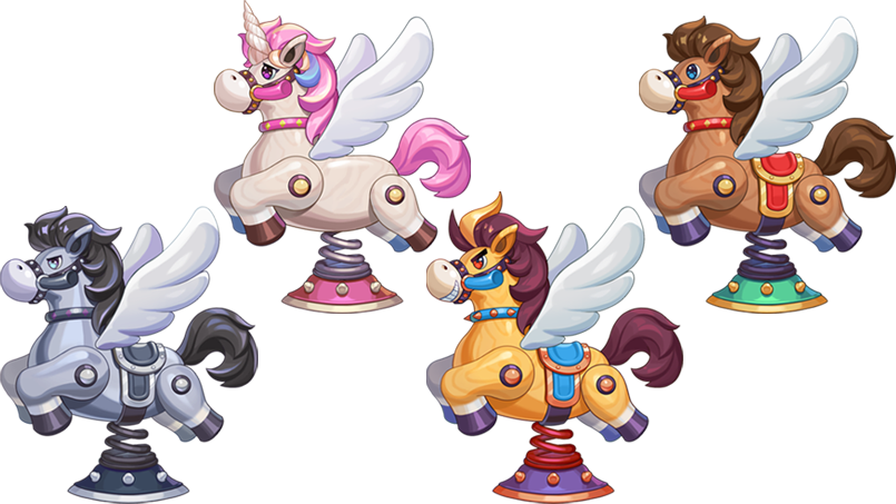 子供達の夢を乗せて走る馬型の遊具 色とりどりの感情とインスピレーションが宿ったとき、楽しそうに体を揺らす。 スプリングポニーは自分を鳥だと自認しているため、自由に空を飛び回る。 予想に反してスイスイと飛ぶため、秩序を失った公園はいよいよ収拾がつかない。